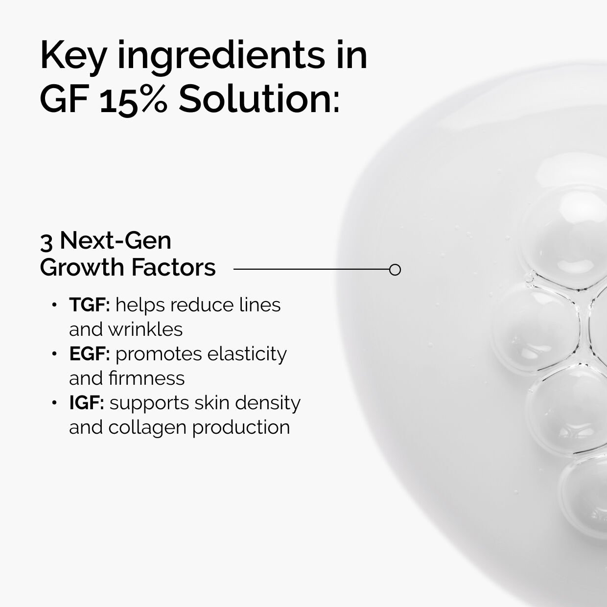 A solution of TGF improves skin’s integrity by supporting natural collagen to minimize visible lines and wrinkles, while promoting skin firmness and elasticity and smoothing skin texture.